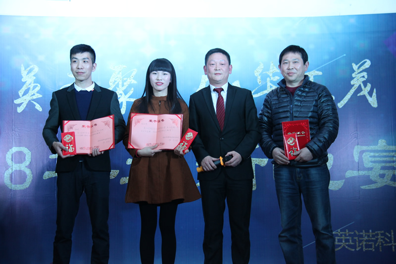 ▲五周年特別貢獻(xiàn)獎(jiǎng) 由董事長(zhǎng)程總頒發(fā)證書及獎(jiǎng)金 授予榮譽(yù)人員:陳斌、林水英、程琥(從左至右排序)